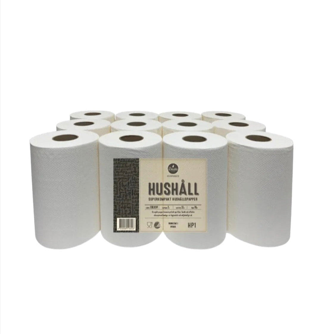 Hushållspappret har en hög, snabb och effektiv absorptionsförmåga, vilket gör att det enkelt tar upp spill och fukt utan att gå sönder. Varje rulle är kompakt och innehåller hela 70 meter papper fördelat på två lager, vilket ger lång användningstid och minskar behovet av täta byten. En förpackning innehåller 12 rullar, vilket motsvarar totalt 840 meter hushållspapper per bal – perfekt för både hem och arbetsplatser som behöver ett hållbart och ekonomiskt alternativ.